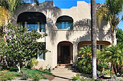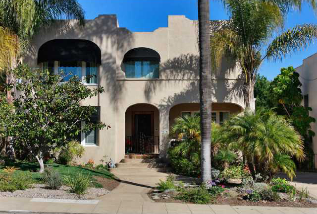 This magnificent Spanish home sits on a large corner lot completely walled in for ultimate privacy. The romantic entry will captivate you with its winding staircase, showcasing a custom mural and leaded French doors leading to a great outdoor patio area. Entertain in the spacious living room with beamed ceiling, hardwood floors and doors opening to the outdoor bar and pool. The separate formal dining room is perfect for cozy dinner parties or large family gatherings. Enjoy cooking in the kitchen with a large picture window overlooking the enclosed courtyard, newer stainless steel appliances and adjoining breakfast area. Watch TV or listen to music in your inviting family room. The fourth bedroom downstairs with attached bath is currently being used as a library and is ideal for a guest room or office. The second floor offers three bedrooms, two baths and two sets of French doors leading to a covered porch with views of downtown and the Coronado Bridge. The lush backyard boasts a large swimming pool, spa and nice grassy area. A detached guest house featuring a "great room" with a Murphy bed, an efficiency kitchen, walk-in closet and bath with skylight. The guest house porch is perfect for relaxing during the warm summer months. Home has been retrofitted by the port with new windows, heater, A/C etc.